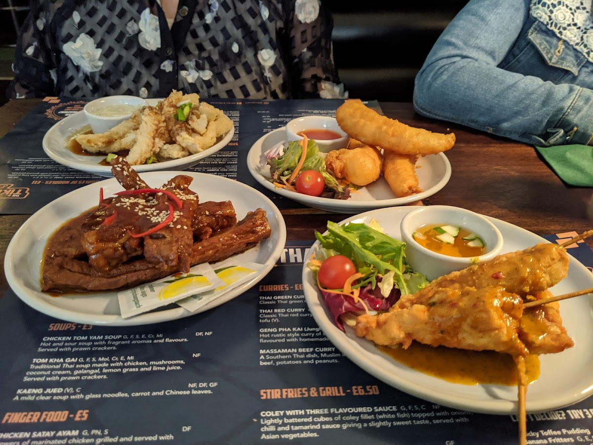Combination of chicken satay, king prawn tempura, spring rolls and corn fritters, served with dips.